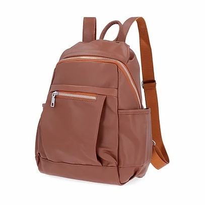 Mochila en cuerina. Reparticiones: bolsillo grande, dos pequeños a los costados y dos bolsillos medianos, uno al frente y uno en la espalda.